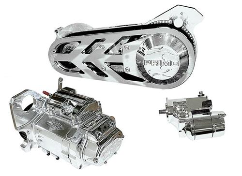The kit replaces your taper shaft 4 speed with a brand new polished PowerDrive™ six speed close ratio splined shaft transmssion made specifically for a swingarm frame. And that is not all. With the kit you get a spankin’ new Primo® Brute IV Extreme™ 3″ polished Open Belt Drive System, a beautiful Monster Torque™ 1.4 kw chrome & polished gear reduction starter, transmission mounting plate and hardware. All this for under $3000 Bucks! This deal cannot be beat. Kit # 1071-0001 will get you into the race!
