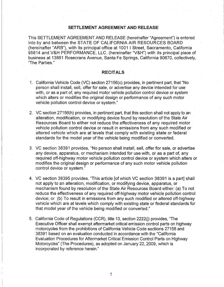 V&H promptly and fully cooperated with ARB during the investigation, and as a result, has already implemented a compliance plan to inform its distributors, dealers, and customers about the types of motorcycle exhaust systems that are legal for sale in the State. In addition, V&H is actively working with ARB’s Aftermarket Parts Section to ensure that all of its aftermarket critical emission control parts that are sold, offered for sale, or advertised in California obtain the necessary exemptions from ARB.