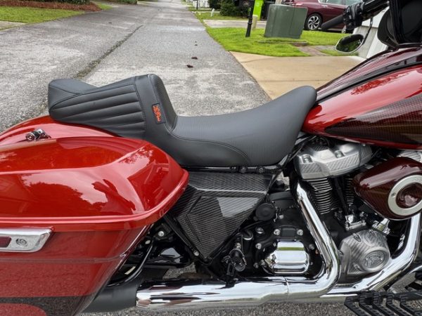 I tried about 10 different seats until I rode a Le Pera Kick Flip. It is a very comfortable seat for me and they were able to cover it with a carbon fiber pattern and a color matched tag. Very cool.