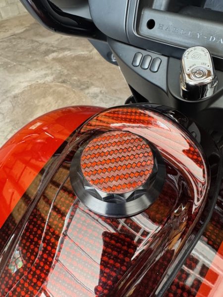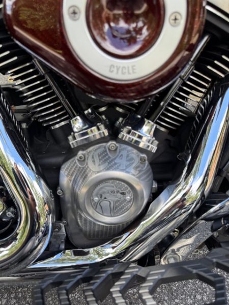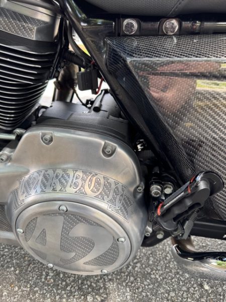 In the end, it’s not a “theme” bike at all… but the bike has a smattering of the carbon fiber pattern with actual carbon fiber parts. The Hoffmann Designs FXR side covers and front fender are actual carbon fiber as is the S&S teardrop air-cleaner. There is paint that looks like carbon fiber (thanks Matt) on the dash, tank, bags and rear fender. The leather on Kick Flip seat has a carbon pattern, thank to La Pera.