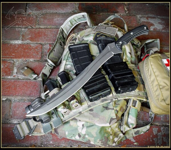 - Sheath: Kydex scabbard with low ride M.O.C. strap + M.O.C. rings + high ride M.O.C. straps