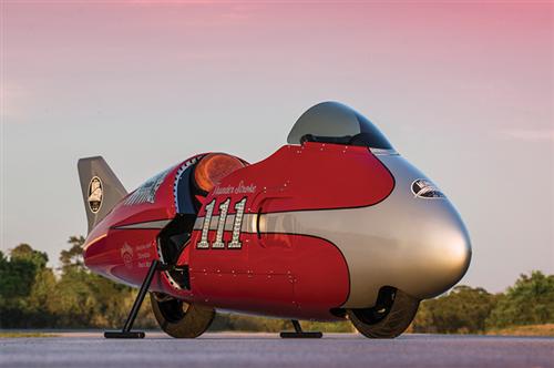 The streamliner was designed from the ground up to house the new Thunder Stroke 111 engine and showcases its awe-inspiring power and performance. The Spirit of Munro is not simply a display; it was built to run. A custom exhaust and intake system is mated with a chain drive conversion to allow for the tall gearing necessary for top speed runs. The all-aluminum bodywork was hand-formed using traditional tools and techniques. Wrapped around the modern Thunder Stroke 111 engine is a custom chassis capable of handling top speeds.