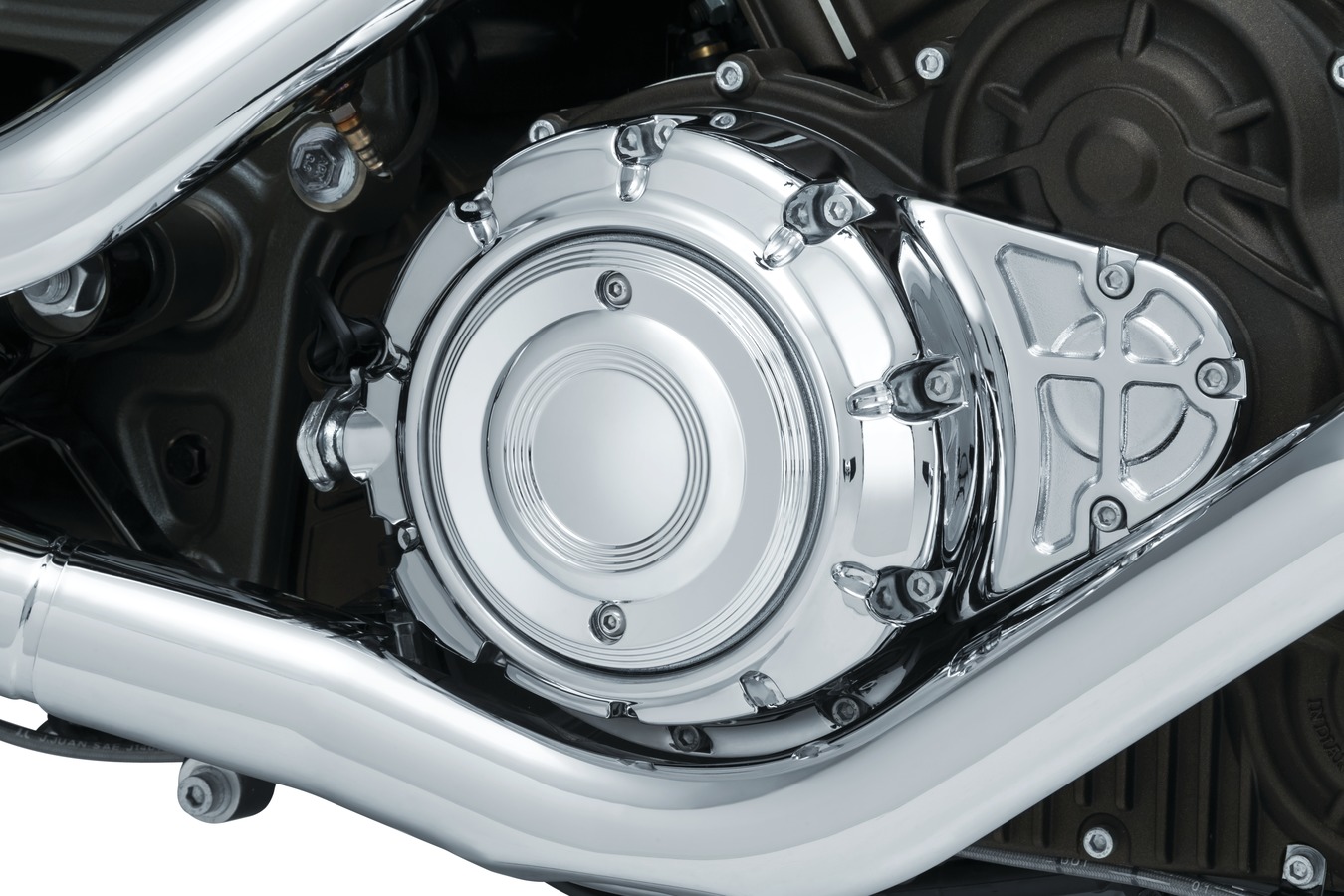 The Legacy collection features a full line of coordinating chrome engine and frame covers, body accents, and select hand and foot control components. Stylistic elements include stepped borders along with centralized speedlines that capture and reflect light to provide depth for a clean, understated custom appearance.