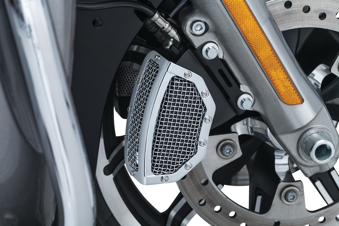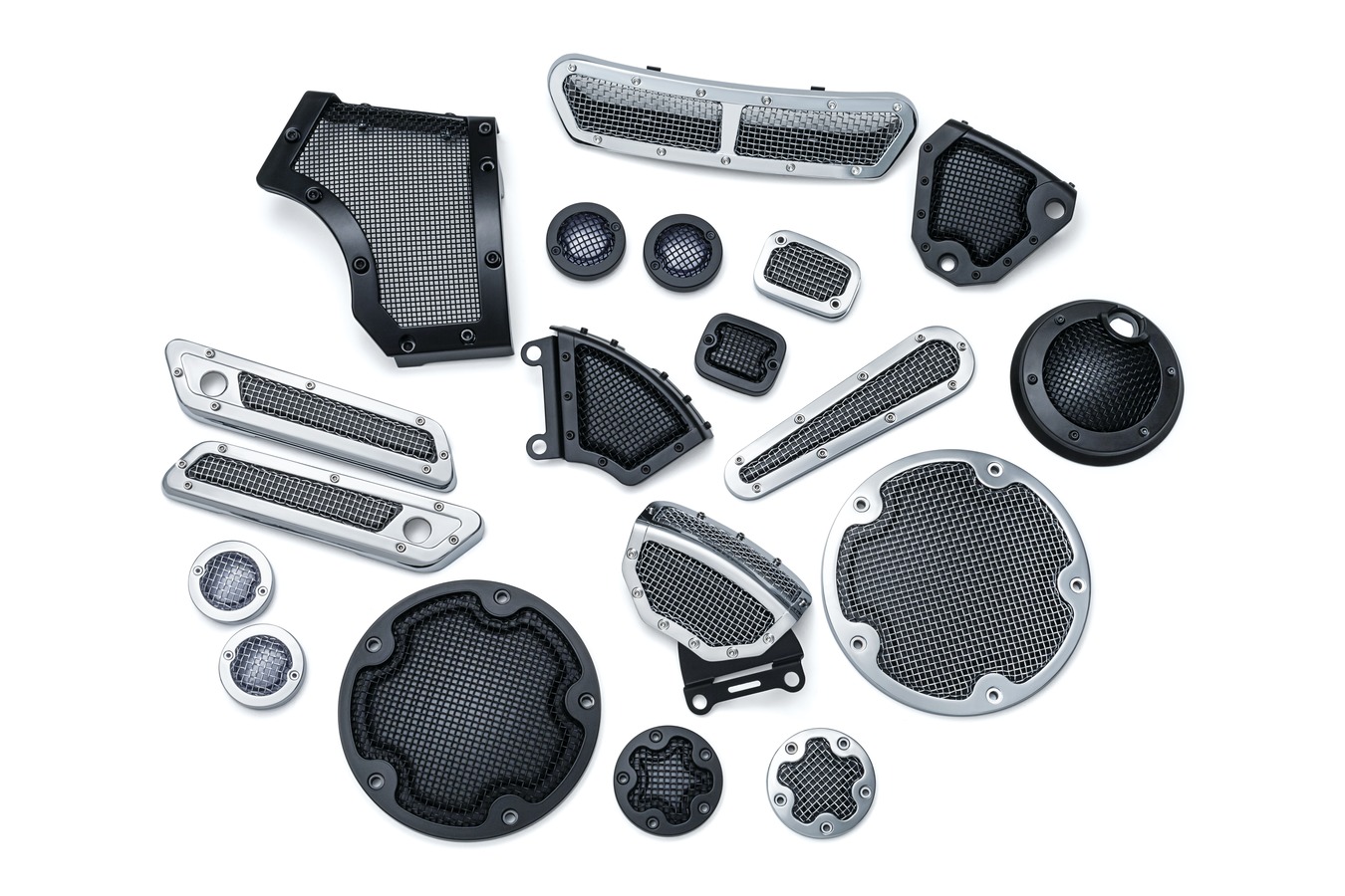 The Mesh collection is loaded with over 50 direct-replacement components for all Harley-Davidson models. Most parts utilize a three-piece design integrating chrome or satin black aluminum outer frames with a satin black aluminum baseplate that’s exposed through satin black or chrome stainless steel mesh panels. The construction method and resulting look is unlike anything available, and unlike anything Kuryakyn has ever developed.