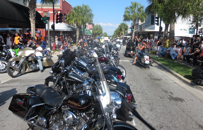 Tom showed up and although he’s walking, he’s not yet able to ride, nor does he have a motorcycle after the crash on the way home from Daytona this year. Because of this Bruce drove down to Punta Gorda in his truck to grab Tom and bring him to the rally. They set out lawn chairs in a doorway on Main St. and I hung there a lot. We ate pizza.