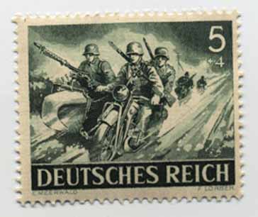 A commercial postcard heralds the national “Armed Forces Day” as celebrated in Defense District 17 located in Vienna and which covered the area of Northern Austria and southern Czechoslovakia. The main image is of a Kradschutze or motorcycle trooper aboard what appears to be a Zundapp sidecar combo, it and the BMW the two main workhorses of the German army during the war. The cartoonlike illustration including images of women and children was designed to promote the “family” atmosphere of the event, part of the program to encourage civilian support and identification with the military. (The artist has incorporated a license plate registration for Anhalt, an area of middle Germany located between the Harz Mountains and the River Elbe.)