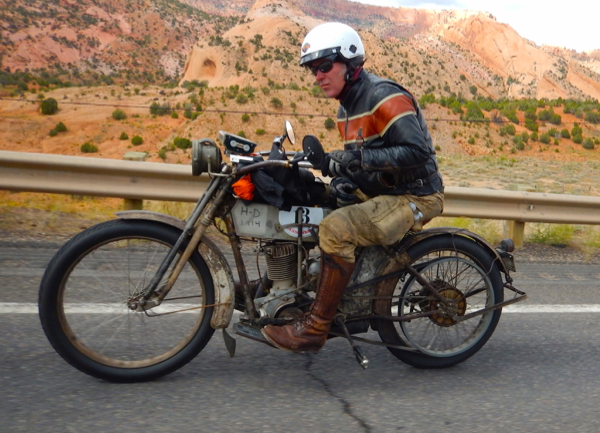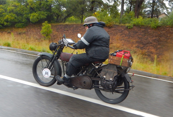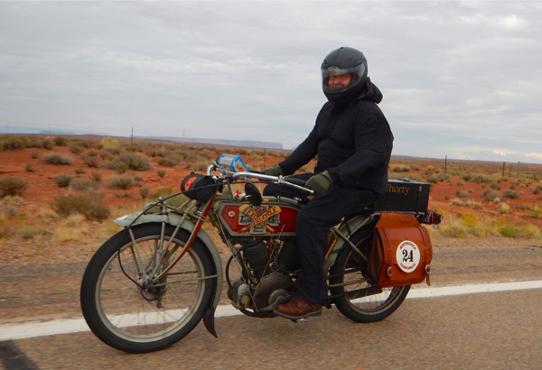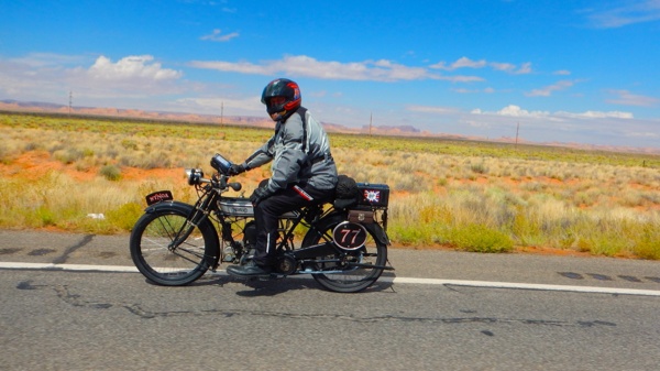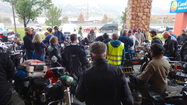 I slept right through my alarm clock. The days have been long and the nights short. It’s beginning to wear on the entire crew. We woke to steady rain, not a welcome sight. Riders began donning garbage bags and goggles, taking last sips of warm coffee but not wanting to have to stop to use a restroom because of the additional clothing. The Motorcycle Cannonball is truly a test of both man and machine. Who will endure to the end??? Only 58 riders started out today. Currently the 5 front runners have been steady. They are on two Harley Davidsons and three Hendersons. Today we face more steep grades as we climb into the High Desert. 262 miles with elevations of 3700 to 8400 feet and a stop at Four Corners Monument. The monument immortalizes the intersection of Arizona, New Mexico, Colorado and Utah. The countdown began and the riders were off!