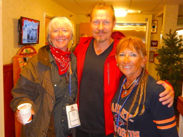 We got to 4 corners with a little break in the rain and pulled into a gravel muddy parking lot. We were able to get a few picture, mixed with many other tourists, before the sky let loose again and everyone huddled near the vendors seeking shelter. I had left my rain gear on the bike so had to run out to retrieve my soaked on both sides gear…. Ugh… A little further down the road many riders pulled into a small trading post for gas. It was busy with locals retrieving mail and buying supplies. They were curious. Darlene, a local Native American motorcyclists stopped to talk to me. She had just ridden home from Texas for a visit and was delighted to see the bikes. As we pulled out I saw another painting on a roof; Love Life. Yes I do.