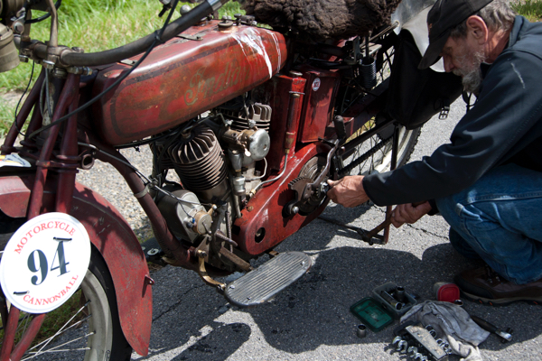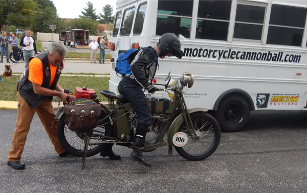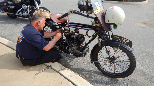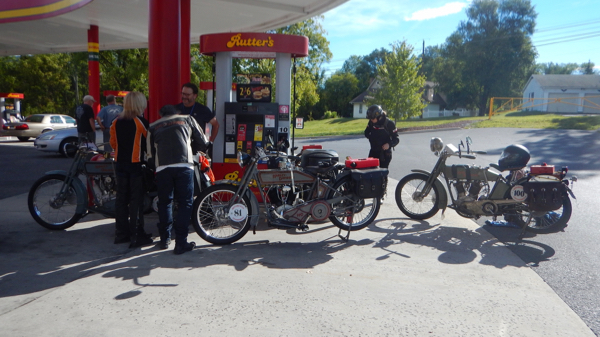 I watched as the motorcycles left and cheered some of them on, then took my luggage to my new awesome friends. The morning was beautiful with heavy dew but a starting temperature of 74 degrees. For the first 41 miles I had to check several times to be sure I was on the correct course! Today we had received 13 pages of written instructions. As we traveled across Eastern Pennsylvania the elevations began to increase. I was amused by street signs: Possom Hollow, Peepytown Rd. A sign caught my attention just before I had a spiritual encounter with some birds in Biglarsville that said “Love Unlimited”. I was jarred back to reality when I came upon a rider, #62, Scott Blaylock from Canada on his 1910 Indian, whose 1.75 HP motorcycle just did not want to climb the increasing hills. We pondered what to do when Joe Sparrow arrived with a rope and towed him to the top. Success! At MM #48 I smelled the exhaust of another rider before I saw him. Sure enough, there was #100 along side the road with support staff. Pat Simmons was having trouble with his bike but it looked like they had it handled. At MM #61, rider #16, Chris Knoop on his 1914 JAP, was working on the shifter and about ready to head out. The higher elevations were beginning to wear on the bikes.