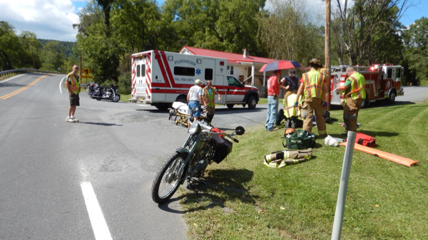 About 20 minutes later I got a call on my phone, I pulled over to see what was up and was told a bike was down 8 miles in back of me. I knew immediately which intersection it happened at since I too had noticed all the gravel coming downhill to that stop sign. I turned around and made my way back before the ambulance arrived. Scott Jacobs was on the shoulder of the road with his wife at his side, support staff, as well as Fire Dept. vehicles were at the intersection. Fortunately Scott was not critically wounded though he ended up in the hospital overnight.