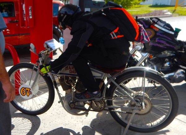 I made it to one of the recommended gas stops with a written warning on our 13 pages of turn by turn instructions that said “ Next refueling stop 75 miles”. Many bikes were being worked on and I sat in the dirt next to my friend Ziggy as he wrenched sharing stories about crows when suddenly we heard an engine revved and a woman’s voice yelling. I turned to see Sharon Jacobs bouncing off the sidewalk of the gas station narrowly missing a van as she engaged her clutch and came to a stop. 5 guys surrounded her bike in seconds and helped her off of it. Doug Wothke made a few adjustments to her bike and after a quick bandage to her finger she rejoined her group. About 15 later I decided to head out. I saw Sharon and Scott just a little while later on a steep grade with support staff and continued on.
