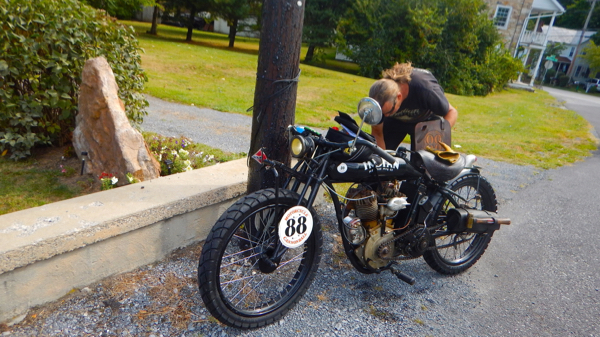 Today began with a flurry of activity, riders lined up by classes. Class 1 is the oldest machines with the smallest engines. They are allowed to leave first, Class 2 leaves 30 minutes later and class 3 leaves 60 minutes after class 1. Even with that advantage, the “newer” motorcycles will likely pass all of the class one motorcycles midway through the course. Day One had taken its toll on a number of the machines. Some of the 28 that had been brought in on a trailer the night before were able to be tweaked or fixed overnight while others were still being worked on. Today promised more rural riding but higher elevations (300 to 3000 ft) and an increase in distance. The riders were ready! Rider began leaving at 7:30 am and were all on the road by 8:45 am. Today we would travel in 3 states, Starting in York, Pennsylvania, traveling through parts of Maryland and end in Morgantown, West Virginia.