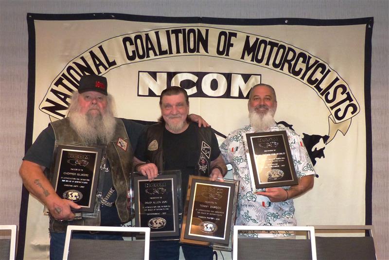 Slider’s blood- and Sons of Silence M/C club-brother “Chopper” Gilmore was later honored during the Silver Spoke Awards Banquet with the Christian Unity award for his ministerial work. Other Silver Spoke Award recipients were: singer/songwriter David Allen Coe for Entertainment; Tommy Simpson of the Outlaws M/C and CMT/ABATE of Tennessee receiving the Freedom Fighter award; and NCOM’s highest honor, the Ron Roloff Lifetime Achievement Award was presented to Florida AIM Attorney Jerry “T” Theophilopoulos largely for his legal work with the clubs, COCs and ABATE of Florida.