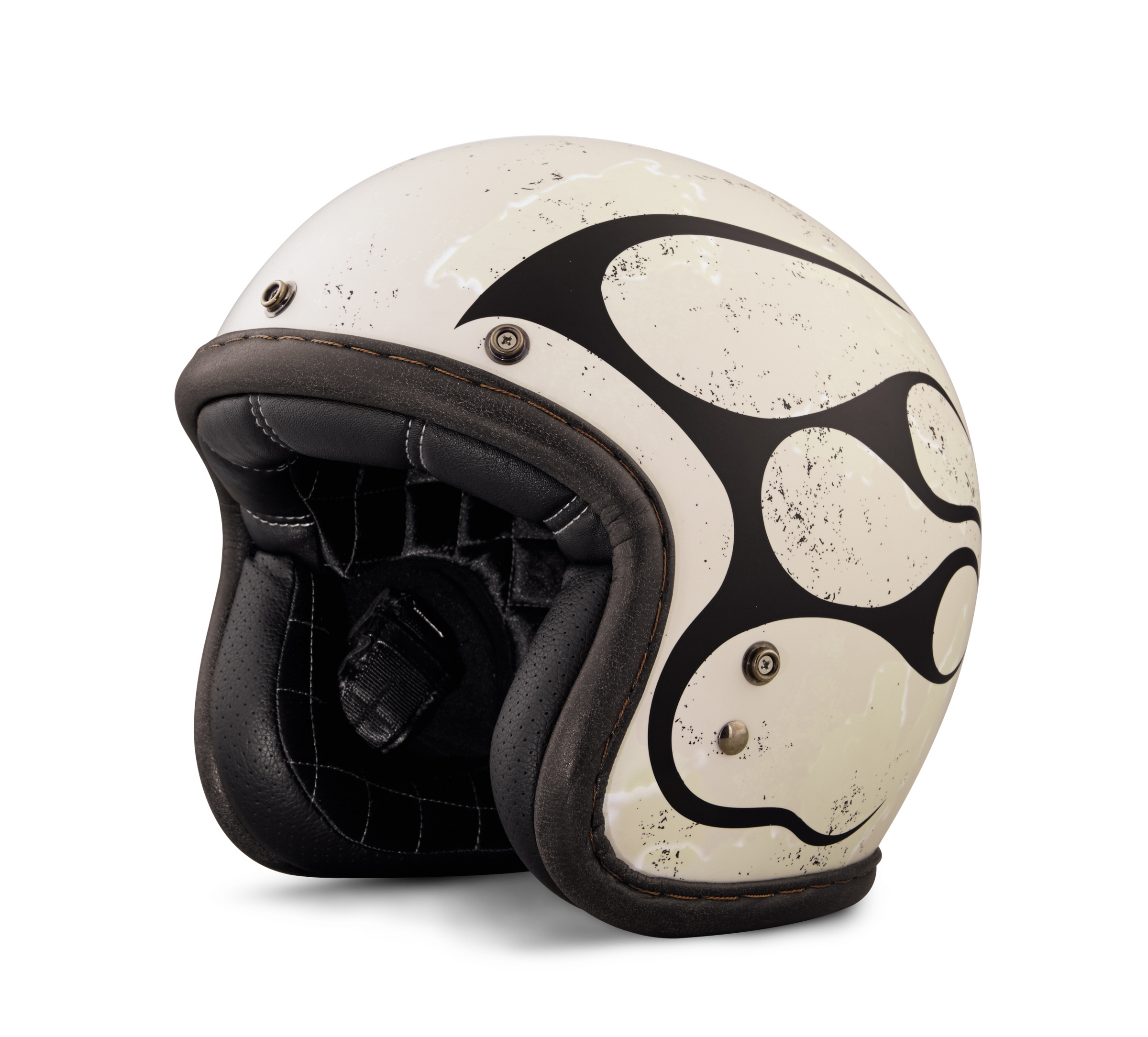 The Cherohala B01 3/4 Helmet (P/N 98184-18VX, $199*) features a classic retro silhouette to hit the road. Each helmet displays all new custom distressed graphics that are unique to each and every helmet. The finishing touches are a distressed cowhide leather trim, snaps for shields and visors and a back goggle strap.