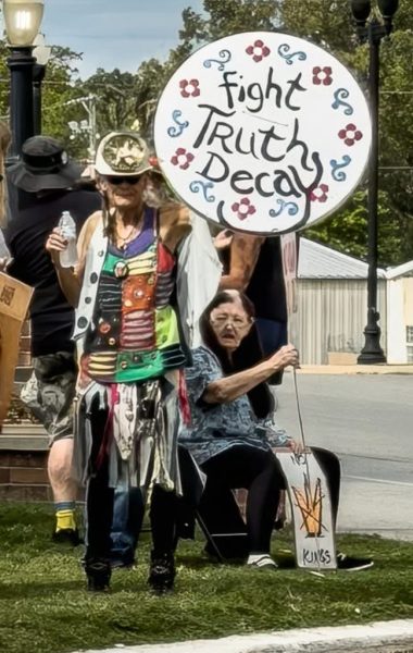It’s ironic, these old broads, have more than likely been Arkansas Democrats for 50-60 years.. at LEAST. Sixty years ago, the young Democrat wives in Arkansas were still walking around like June Cleaver ironing their husband’s KKK costumes and hangin’ them on the clothesline. Now they up there on the town square wearing crochet and tin foil crowns and Janis Joplin clothes and actin’ a damned fool. Them old broads probably sweated their way through menopause having the hot pants over Guvnah Bill Clinton in 1992. They were so old they probably remember what America did to King George. Somebody really, really needed to go get their grannies and explain to them how they are gonna wind up as Arkansas meme fodder, hangin’ out on the town square with their hair dyed like a skunk, braless, pendulous breasts swingin’ in the breeze, holding a sign that says ‘Stop Truth Decay’, just a’grinnin’ without a tooth between ‘em in their bony little shrunken heads. It doesn’t say much for your event if your crowd is so old they are farting cemetery dust.