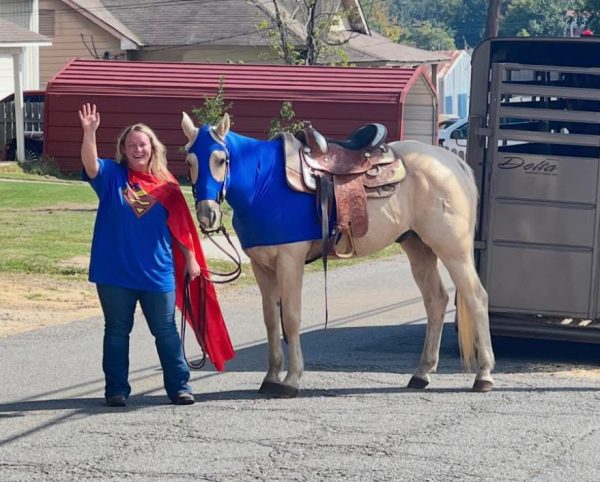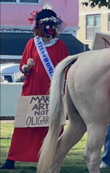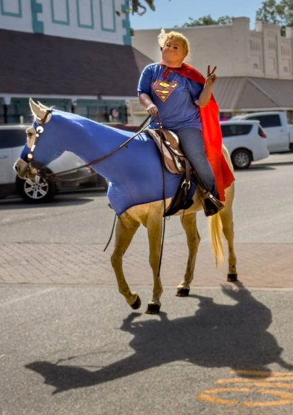 There were a few younger people there, too. Most of them were quite…. Unusual. One in particular really confused everyone. She had on a long cheap red dress with a silver sequin collar, like a disco queen Handmaid… but that was not the oddest part of her outfit; not at all. Nestled beneath a feathery afro wig and red Mrs. Brady hair, was a mask that was undeniably, a blackface mask. This little ol’ white girl seriously put on blackface and a slave dress and went snd stood on the town square at noon on Saturday…. And she wound up proving what a horse’s ass she truly was when she found herself up close and personal with the business end of a four legged counter protestor named Sonny. Sonny was ridden in by counter-protestor Amy Dickerson. With the sound of thundering hooves on pavement drowning out the feeble, papery liberal voices screeching dirty words, Amy rode in on her trusty steed, cape flying behind her. She rode around and around the gathering on her horse names Sonny, wearing a ‘Donald Trump as Superman’ costume and laughin’ her ass off.