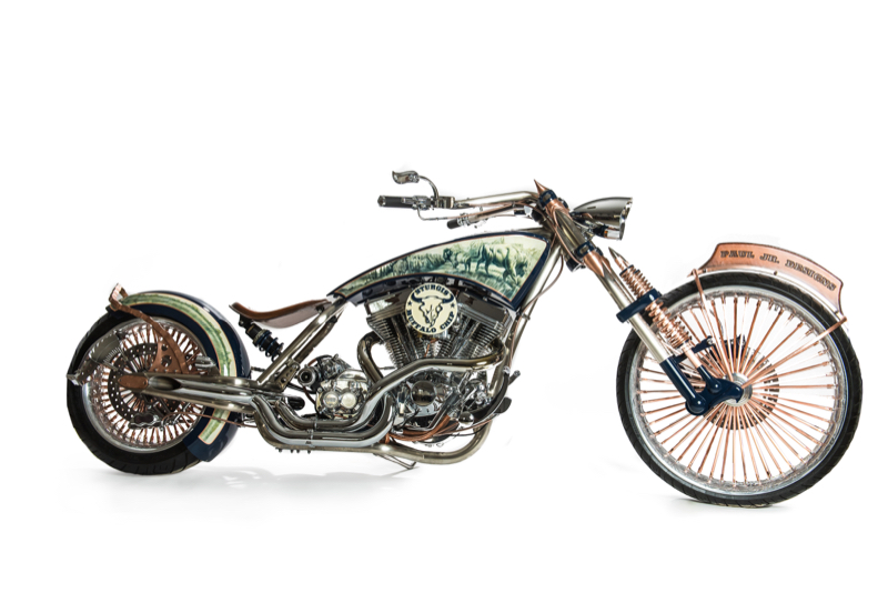 Teutul’s vision for this motorcycle pushed the limits of creativity beyond the norm. The result is a muscly old-school design that captures a taste of the Old West with a punch of steampunk thrown in. Teutul fashioned every detail to fit the theme, including Old West scenes airbrushed on the split tank, copper and brushed nickel accents, hand-engraved Sinister wheels with copper spokes and an undulated copper sissy bar,. This beauty offers a powerful yet comfortable ride with a 107ci 115 HP Ultima engine and 120 LB FT torque controlled by a Baker 6-speed transmission and a Rivera Primo Primary.