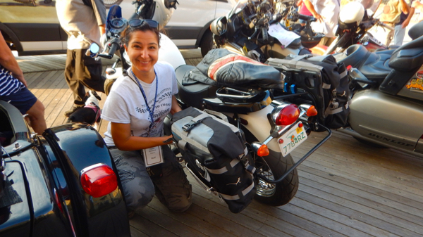 The crowd grew as the bikes arrived. Tourists and locals were delighted to have been so fortunate as to happen upon such a great event. Pictures, videos, laughter and conversation filled the air. Even a police officer, initially annoyed at what was happening realized that he was witnessing an unusual and historical event and arranged for Police escort to get the bikes out of the downtown area (thank Felicia Morgan)! Finally we were done and the ride began about 30-40 minutes late and so it began, two of the riders were loaded up at the boardwalk.