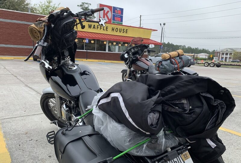 Even though we have a light day of riding my back screamed, remember the ergonomics. I pull out some Delta 8 gummies and CBD capsules and pop them at our first Waffle House stop. These are water soluble natural goodness that start working in 20 minutes. They put a smile on my mug and a bounce in my throttle.