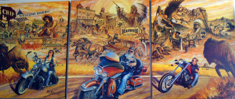 Legend Rider is a commemorative series of paintings produced specifically for the Sturgis Rally. In this series, “Motor” Marc connects the strength of the legendary lands with the power of iron horses rider. With the artistic depiction of an era gone by, this limited edition work-of-art will impress the true legend rider motorcycle enthusiast. Each of the three pieces is filled with historical depictions of the Black Hills area where the Sturgis Rally is held. From buffalo majestically roaming the area, to the Devil’s Tower, to Mount Rushmore, these pieces chronicle the history of the Black Hills area with motorcycle riders right in the forefront. Each of the pieces can stand alone, or be hung as a panoramic group to show the riders on the same broad road.