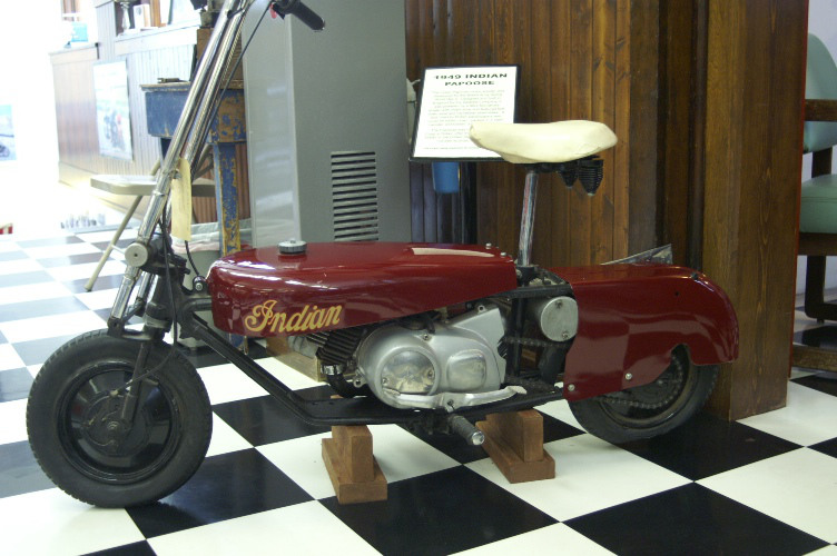The Indian Papoose motor scooter was developed after World War II and was based on an earlier motor scooter called the Welbike, which was actually built for the British Army. The Welbikes were designed to fit into a standard parachute airdrop container 51 inches long, 15 inches high, and 12 inches wide.