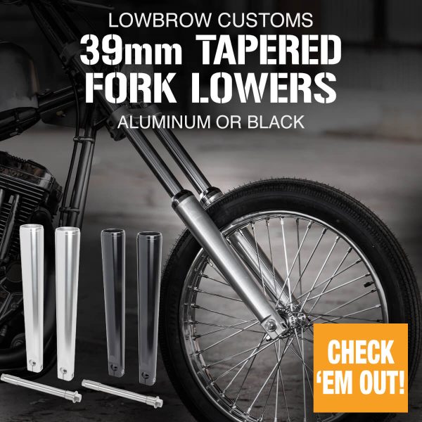 Lowbrow’s 39mm Tapered Fork Lowers are super easy to install, affordable, and instantly change the look of any narrow glide front end.