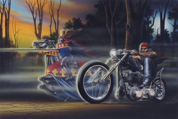 I worked with Dave on this painting, which became his most successful series with the Ghost Rider. Here’s the story about the original and how it ended up in Canada. On August 1979 John Turner entered his 1969 Triumph Chopper bike named British Beauty at the Edmonton Alberta Northlands Sportex Show and Shine Bike show.