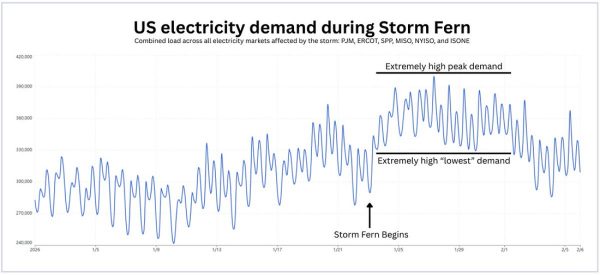 Arguably, the single most important time for a power source to operate reliably is during winter storms, where demand is high, persistent, and existential. E.g., the cold from Storm Fern generated near-record winter demand throughout the country, causing a week-long period of extreme electricity consumption such that if the power went off many Americans would quickly freeze to death.⁶