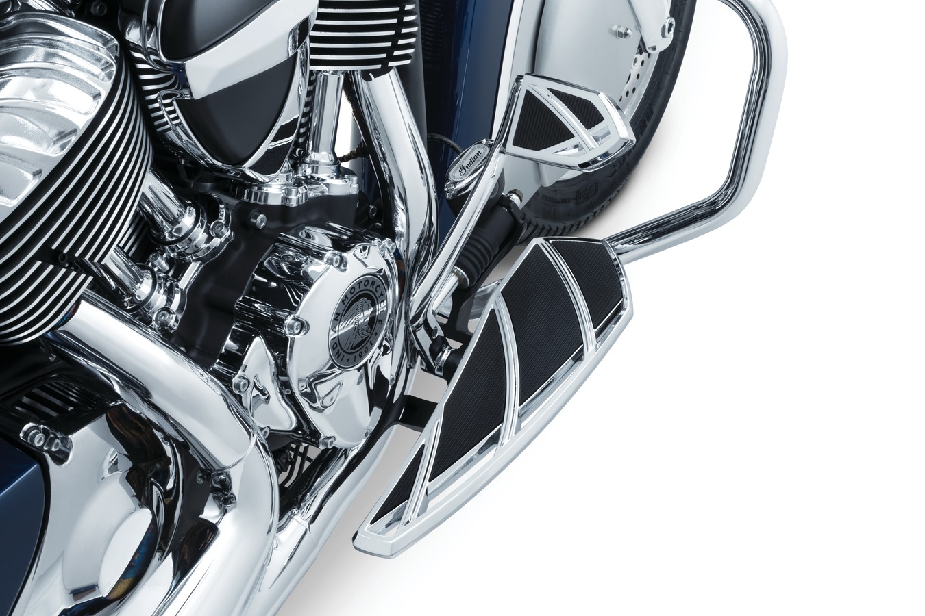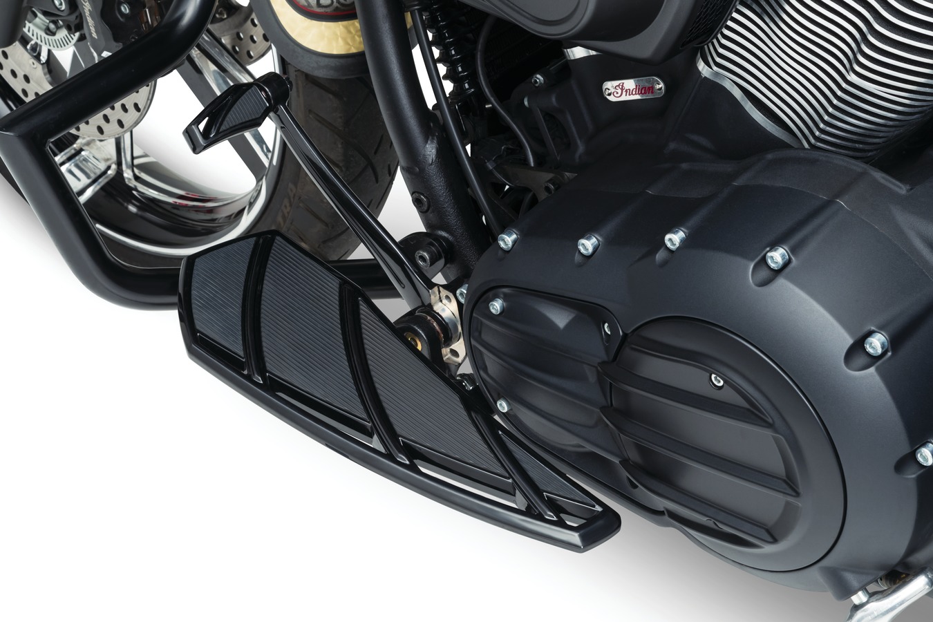 Phantom Driver Floorboards are direct replacements and give the classically styled Indian Chief, Chieftain, Roadmaster and Springfield models instant attitude. A sweeping tapered design delivers a modern look and offers riders ample foot room and a solid foundation for stability, traction and vibration-dampening comfort. Complementing the aggressive look of Kuryakyn Phantom Floorboards is the Phantom Brake Pedal Pad, also a direct replacement for Indian big twin models.