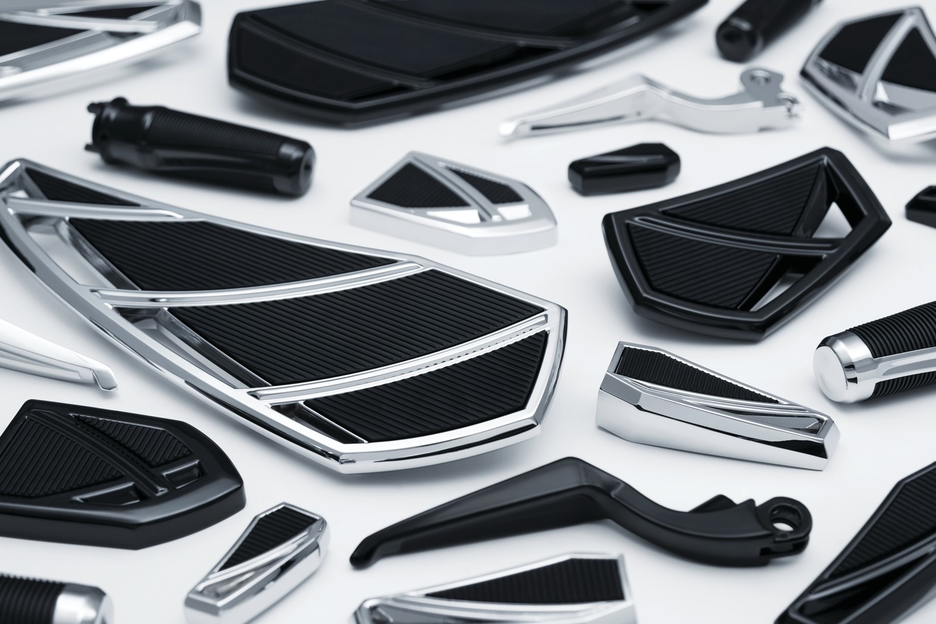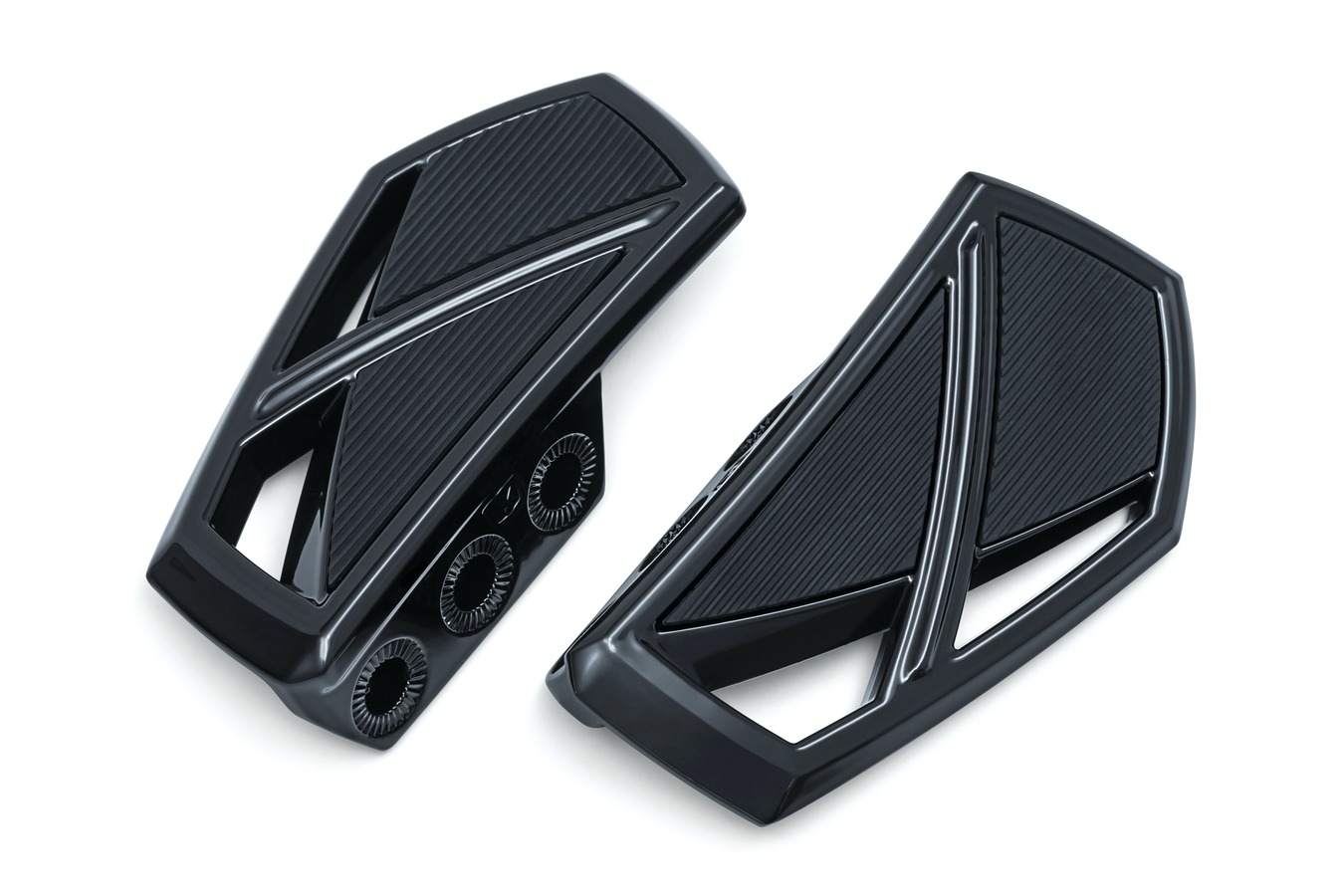 Available in chrome or gloss black finishes, Phantom foot control components are constructed from premium aluminum alloy with durable EPDM rubber pads that will not harden, crack or wear over time. Signature design cues include pass-through styling and sleek angular housings that complement a variety of bikes.