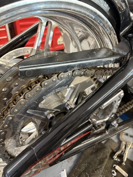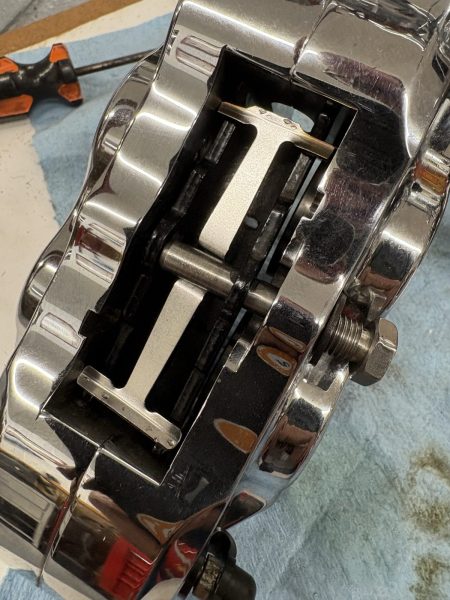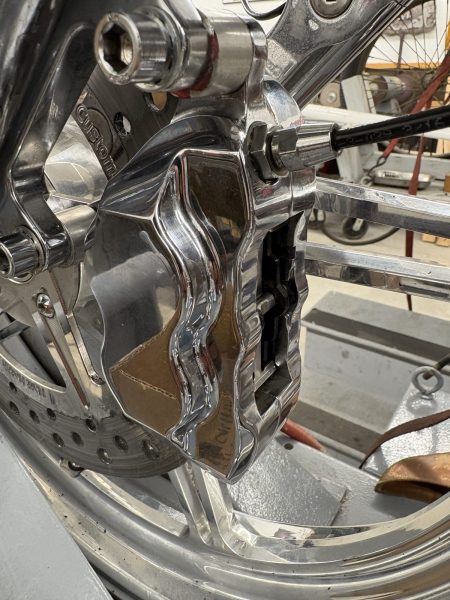 I’m getting close. The pipes are key. The front Hawg Halters caliper leaked. I bought a rebuild kit through Deadwood Custom Cycles and then decided to let them put it together, but they couldn’t complete the task. I fixed it my modifying the spring clip.